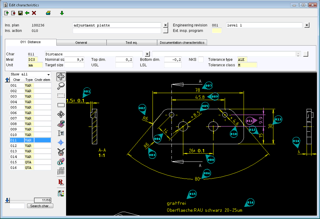 - The characteristics taken from the drawing into the inspection plan are listed on the left side of the form.