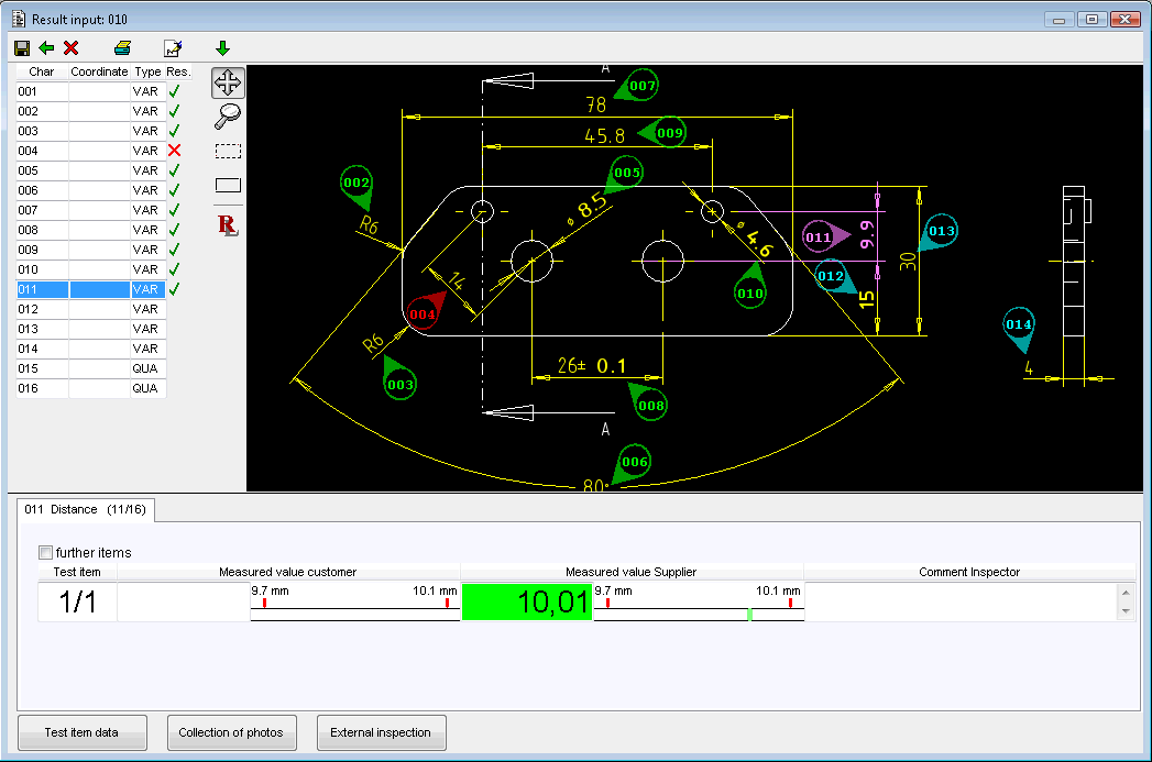 - Highlighting of the characteristic in green or red (tolerance exceeded). Characteristics that are shown in blue have (still) not been inspected.