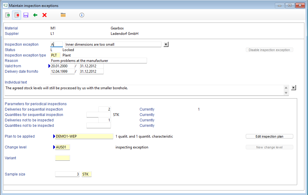 - Specification of the number of consecutive deliveries or quantities not to be checked.
