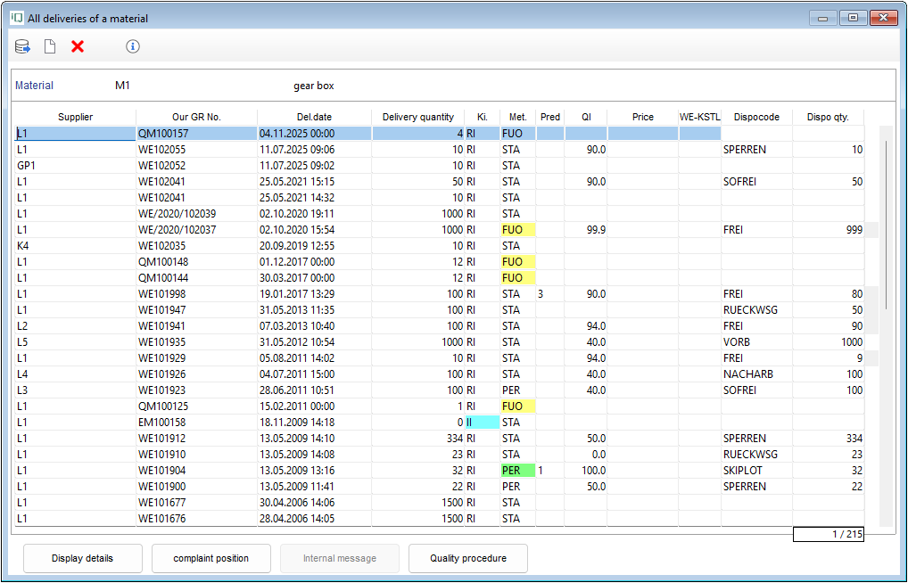 Overviews of all inspection orders for the parts/supplier's combination, complete delivery history
